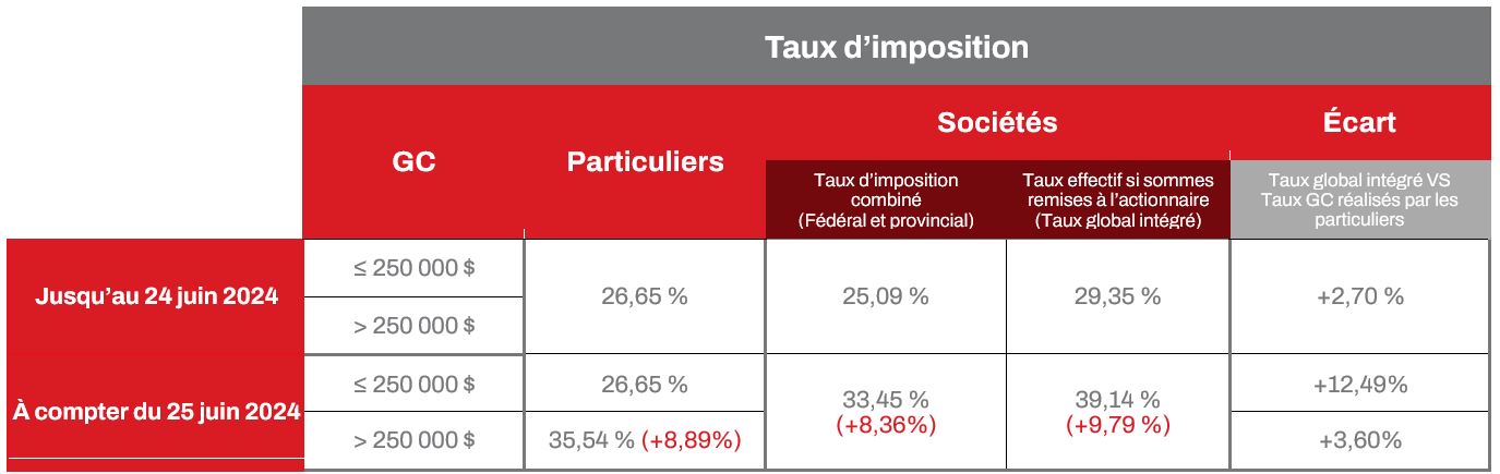 Pour les transactions survenues le 25 juin 2024 et subséquemment, le taux d’inclusion des gains en capital (GC) réalisés passe d’une demie (50%) à deux tiers (66,67%) pour les sociétés et les fiducies1. Pour les particuliers, le taux d’inclusion demeure à 50% pour la première tranche de 250 000 $ de GC nets réalisés dans une année d’imposition2. Il est à noter que ce plafond de 250 000 $ est annuel, non reportable et se partage entre les avantages liés aux options d’achat d’actions d’employés et les gains en capital d’un particulier.
