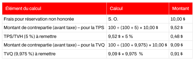 En appliquant cette formule aux taux de taxes actuellement en vigueur pour la TPS (5%) et la TVQ (9,975%), un restaurateur qui impose des frais de 10 $ à la suite d’une réservation non honorée sera réputé avoir perçu les montants de taxes suivants :