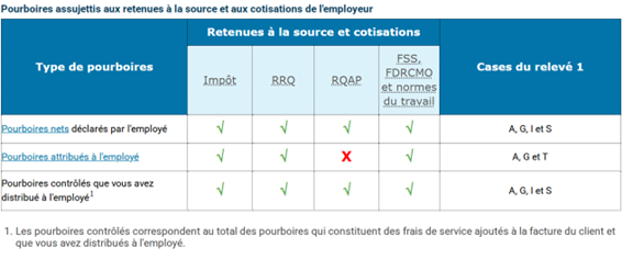 1 Si le total des pourboires déclarés par un employé est inférieur à 8 % des ventes admissibles, l’employeur doit attribuer la différence comme pourboire attribué à l’employé (pourboire fictif). Ce montant est également assujetti aux mêmes retenues, sauf pour le RQAP, qui n’est pas applicable dans cette situation.