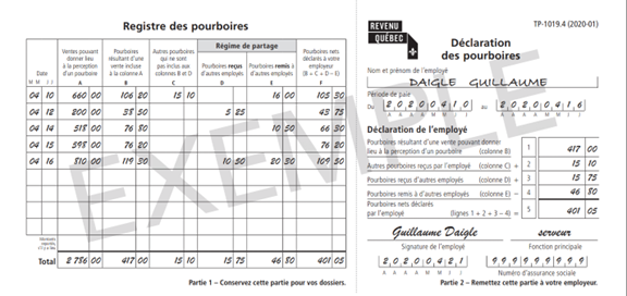 L’employeur est tenu de tenir compte en totalité de la déclaration de pourboires que lui remet l’employé (formulaire TP-1019.4 ou tout autre document équivalent). À la fin de chaque période de paie, il doit :