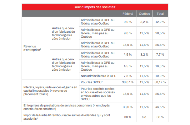 Le taux général d’imposition des sociétés au Québec est de 11,5 % sur le revenu imposable, auquel s’ajoute le taux fédéral de 15 %, pour un total combiné d’environ 26,5 %. Certaines entreprises peuvent toutefois bénéficier d’un taux réduit si elles se qualifient pour la déduction accordée aux petites entreprises (DAPE).