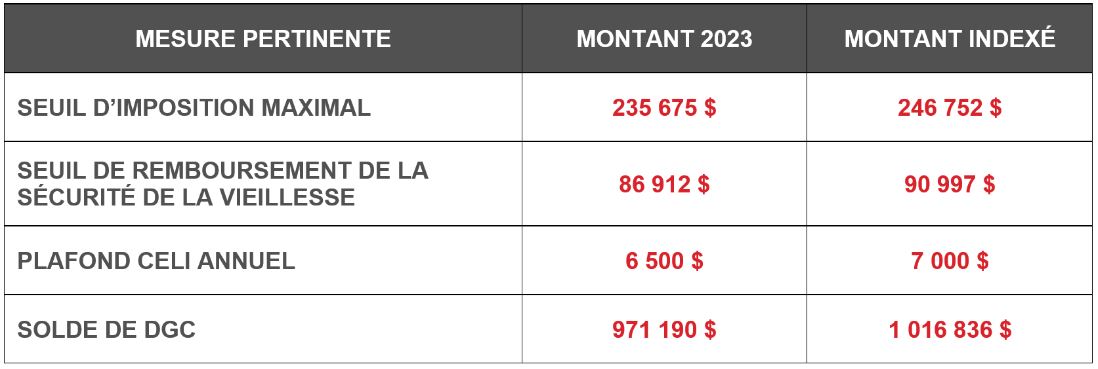 Each year, certain tax amounts are indexed to inflation. The Canada Revenue Agency has published the new amounts that will come into effect on 1 January 2024 based on indexation at a rate of 4.7%. This document sets out some of the relevant amounts, including :